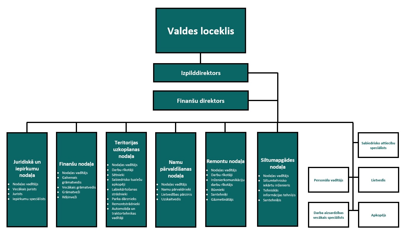 Finanšu direktors uzrauga un koordinē Juridiskās un iepirkumu nodaļas, Finanšu nodaļas, Teritorijas uzkopšanas nodaļas, Namu pārvaldīšanas nodaļas, Remontu nodaļas un IT procesu pārvaldības funkciju izpildi, kā arī personāla vadītāja, darba aizsardzības vecākā speciālista, sabiedrisko attiecību speciālista, lietveža un apkopēju darbu.