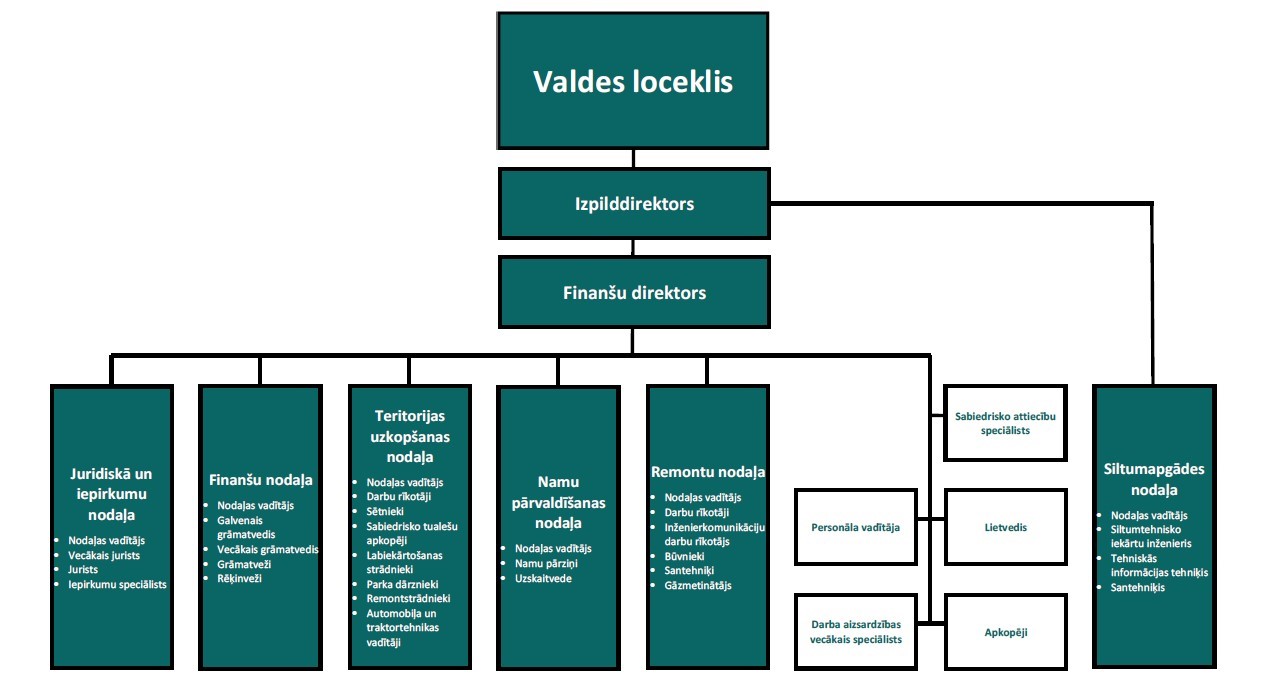 Finanšu direktors uzrauga un koordinē Juridiskās un iepirkumu nodaļas, Finanšu nodaļas, Teritorijas uzkopšanas nodaļas, Namu pārvaldīšanas nodaļas, Remontu nodaļas un IT procesu pārvaldības funkciju izpildi, kā arī personāla vadītāja, darba aizsardzības vecākā speciālista, sabiedrisko attiecību speciālista, lietveža un apkopēju darbu.